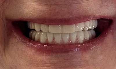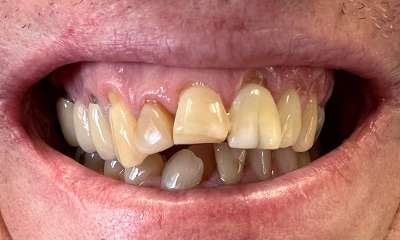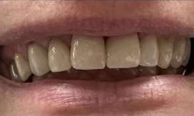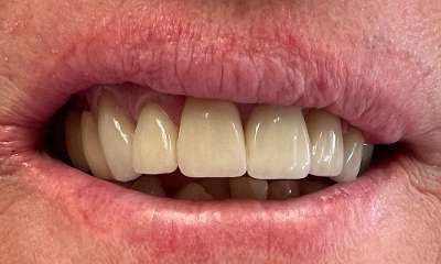 Crowns placed on front teeth to fix worn edges and darkening color of teeth. Crowns created harmony amongst the front teeth and gave the patient a more youthful smile.