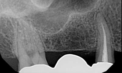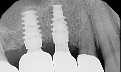 Anchor tooth for the patient's bridge failed and had to be extracted. Patient had two implants placed rather than replacing with a longer-spanning bridge.